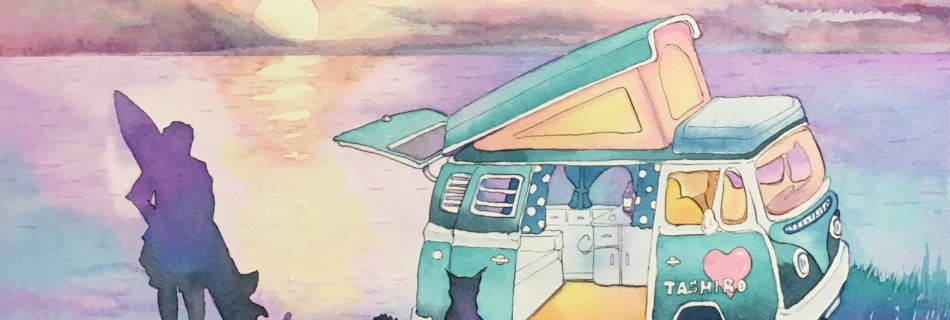 風景画に追加 数年前から描きたかったイメージ。 ルーフテントは憧れてます。 サーフィンはやりませんが、 こんな車でスケッチ旅行に行きたいです。